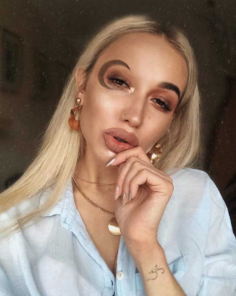 Последней модной новинкой 2020 года стали брови в виде полумесяца, обрамляющие половину лица. Для того, чтобы воссоздать столь необычную форму, вам вовсе не обязательно сбривать часть волосков. Их можно замаскировать тональным средством. Вторую часть полумесяца можно дорисовать карандашом.