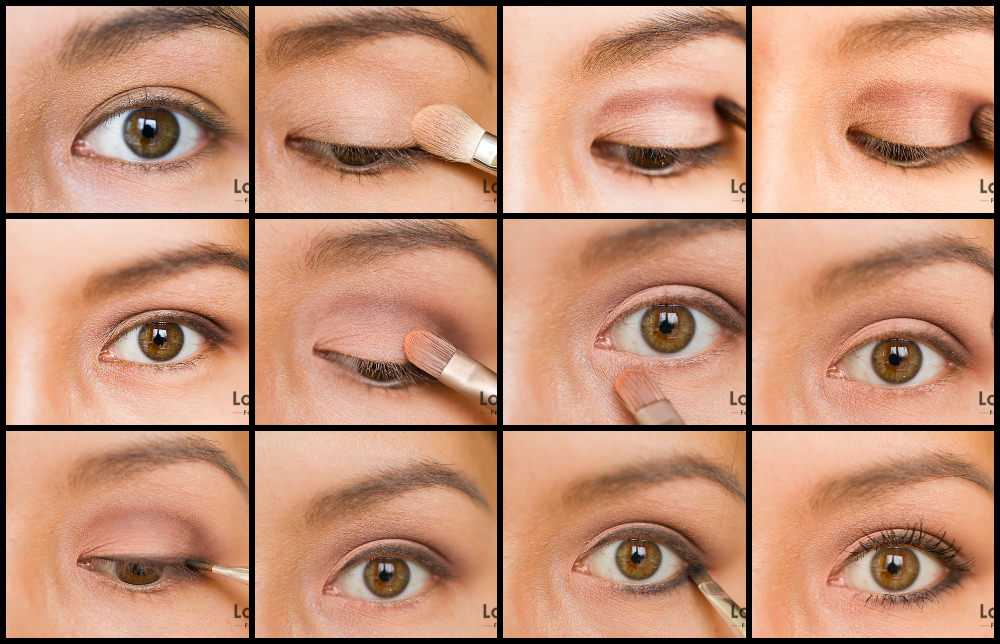 На всё подвижное веко наносится светлый оттенок подходящей температуры. Орбитальная складка прорабатывается более тёмным натуральным коричневым цветом для создания глубины. Третий оттенок наносится на внешний уголок глаза и оттушёвывается немного к виску. Это позволит создать вытянутую форму глаза, что визуально их увеличит. Для этого стоит использовать в макияже тёмно-коричневые или бронзовые оттенки. Этим же цветом прорабатывается нижнее веко вдоль роста ресниц. И завершающим этапом самым светлым перламутровым оттенком выделяется место под бровью и внутренний уголок глаза.