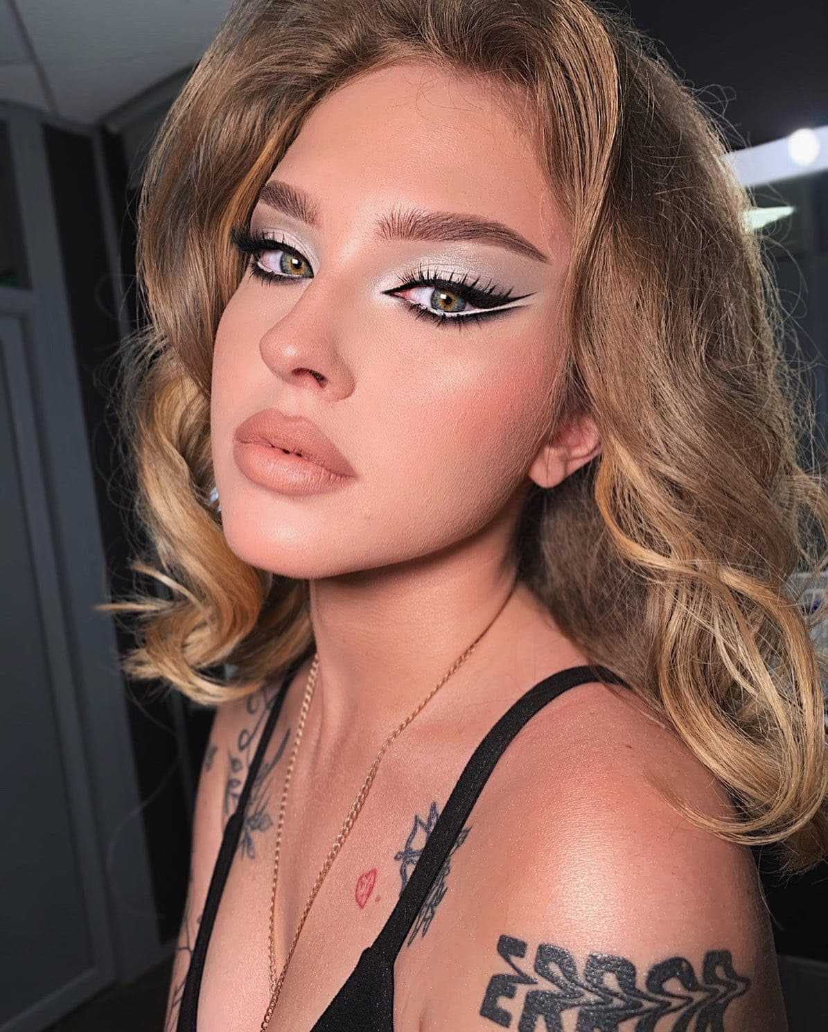 Нежным и романтичным натурам наверняка придется по вкусу эта необычная идея. Ничего сложного в этом нет, нужно просто дополнить нанесенный макияж милыми сердечками небольшого размера в области верхних век. А чтобы они красиво выделялись в макияже, для их нанесения используйте насыщенные оттенки коричневого, на которых маленькие нюдовые сердечки будут смотреться просто восхитительно. Эта необычная идея поможет создать романтичный макияж на Новый год 2022 для женщин с голубыми глазами.