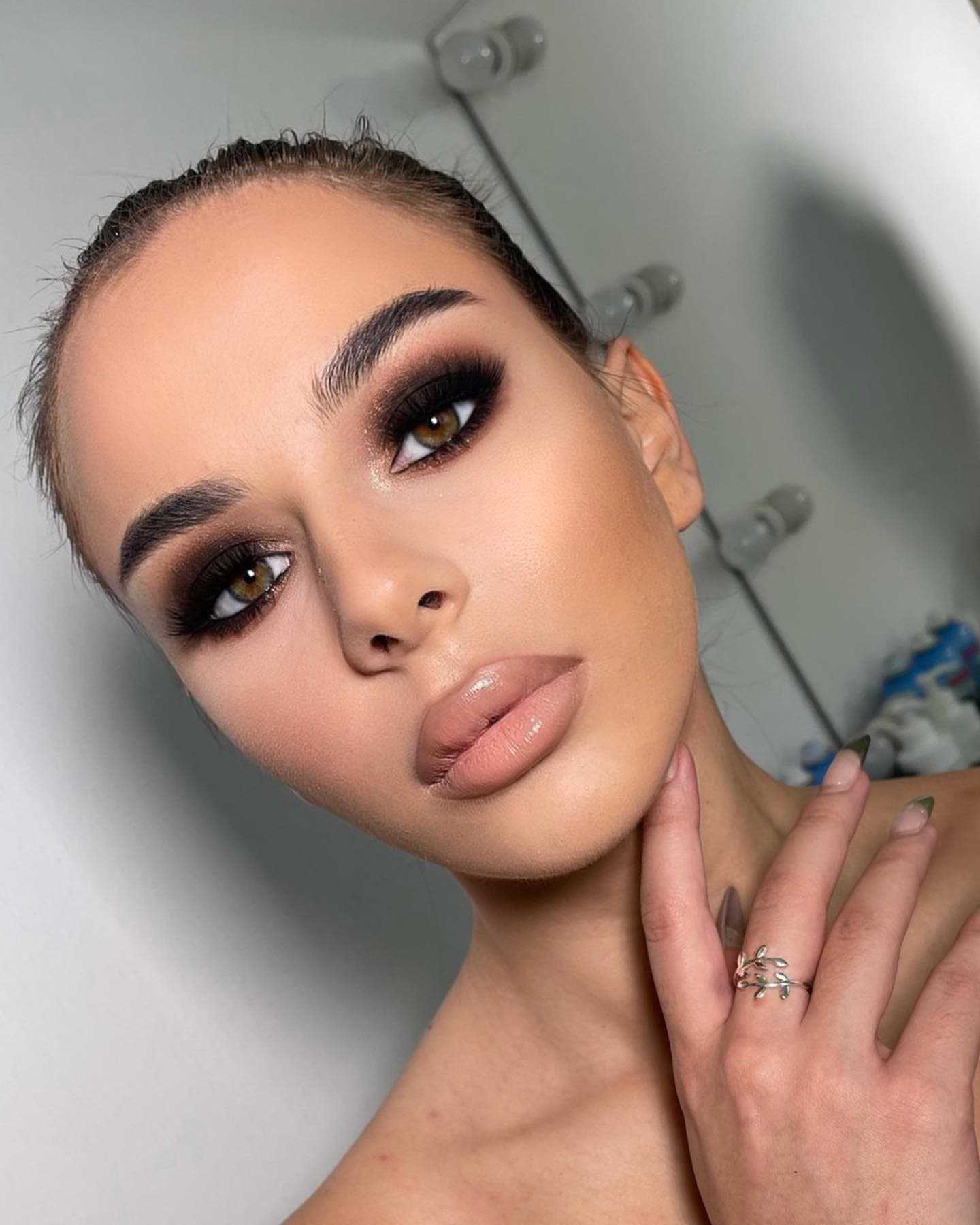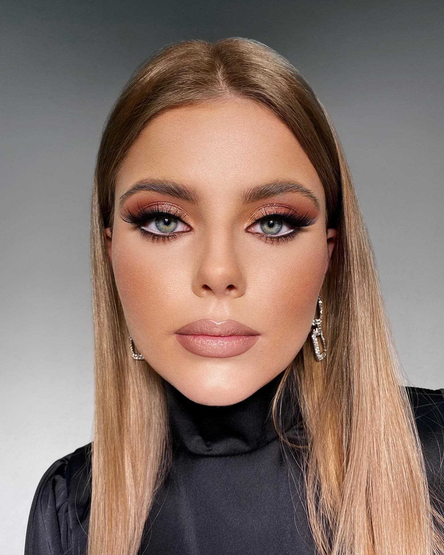Сделать губы более яркими и придать взгляду большую выразительность поможет макияж, выполненный в натуральных тонах. Подобный образ идеально подойдет для празднования новогоднего торжества в кругу близких людей и для корпоративной вечеринки. Разные оттенки бежевого, персикового и розового – идеальный выбор для натурального макияжа.