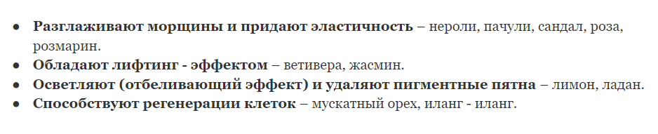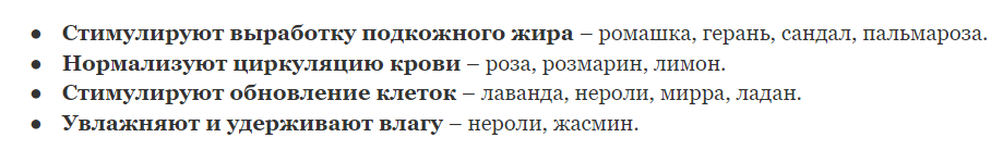 | Сухая, чувствительная, возрастная | жасмин, лаванда, лимон, ромашка, роза, сандал, чайное дерево |