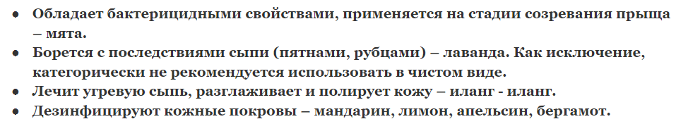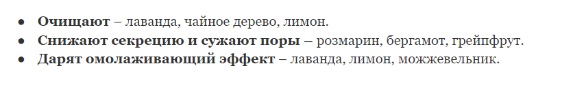 | Жирная | бергамот, грейпфрут, лаванда, лимон, мандарин, можжевельник, мята, пихта, ромашка, чайное дерево |
