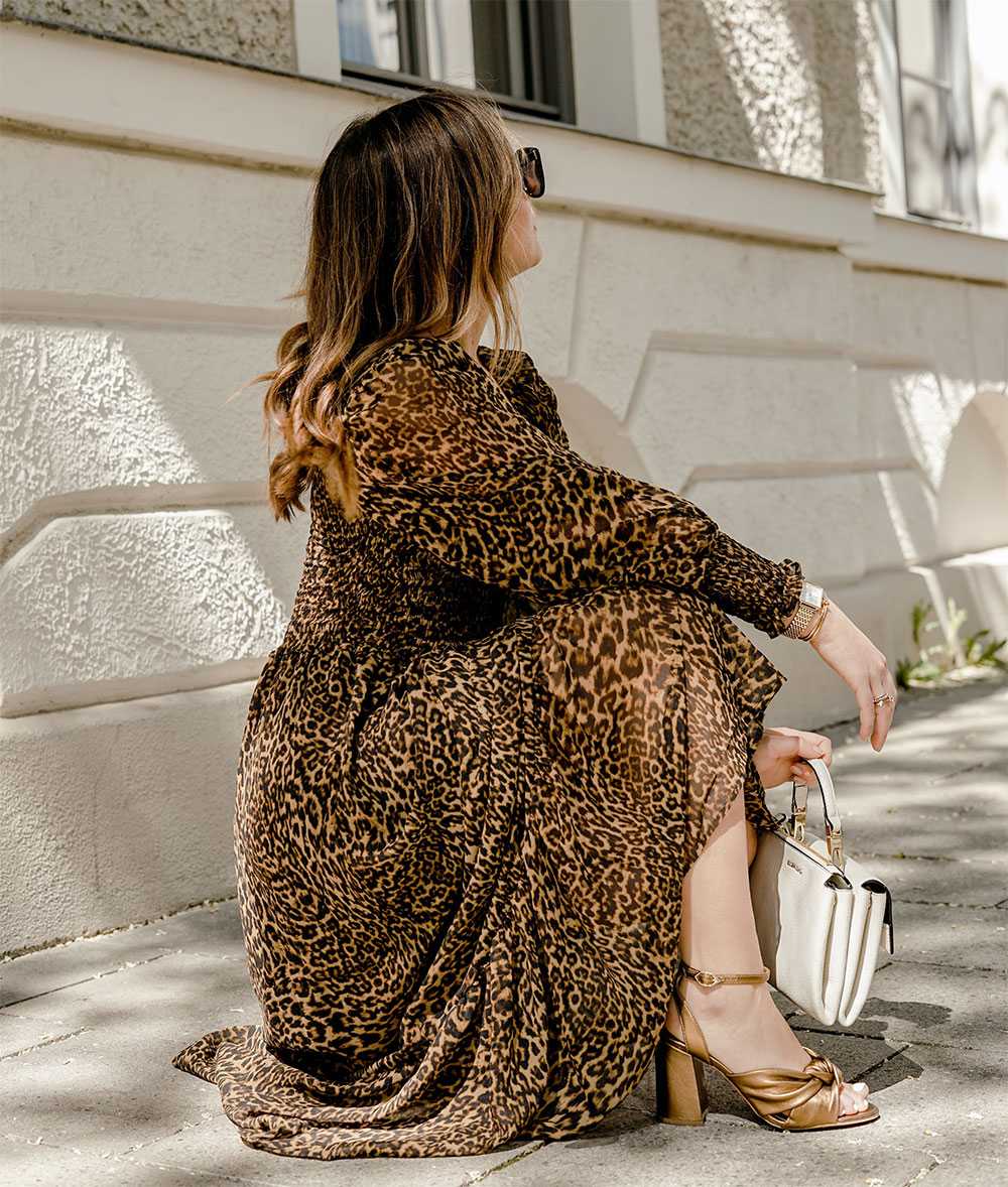 Леопардовое платье всегда должно быть вещью №1 в образе. Обуви и аксессуарам отводится более скромная роль второго плана. Украшения допустимы, но в минимальных количествах и лучше в золотом исполнении.